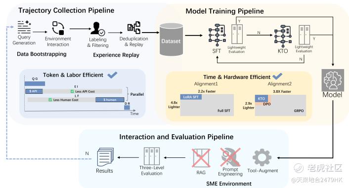 低成本:采用自进化数据收集,online 环境采集,保证数据质量的同时人工标注费用节省 81%。使用 SFT+KTO 优化方法,辅以 lora、deepspeed、liger-kernel 等训练优化策略,32B模型仅需 35 GB GPU 显存,相比于传统全量微调大幅降低算力门槛。
