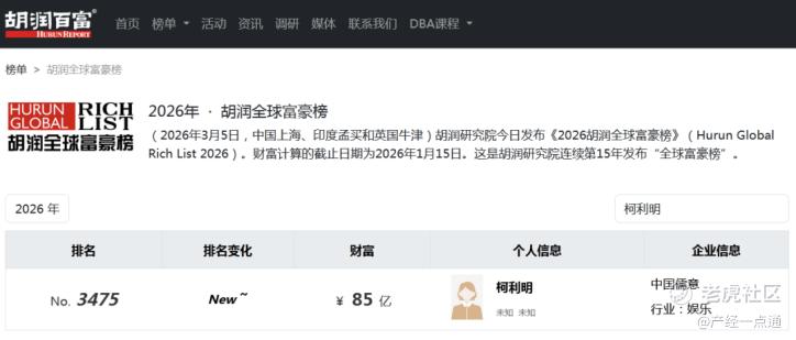 柯利明在影视圈名气不小,打造过多个爆款,还是富豪榜常客。今年3月,他以85亿元的财富跻身《2026胡润全球富豪榜》。