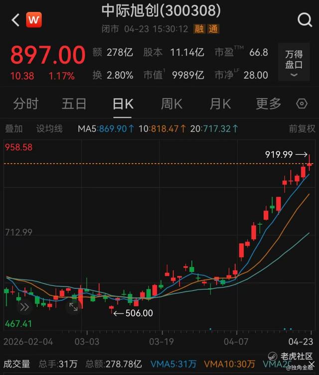 4月23日,光模块龙头中际旭创(300308.SZ) 开盘后股价直线拉升近3%,盘中股价高点达到919.99元,市值超万亿元,成为继工业富联后第二只总市值突破1万亿的算力硬件股。尽管收盘回落至897元/股,市值为9989亿元,但单日278.78亿元的成交额,依然说明资金博弈的火热程度。