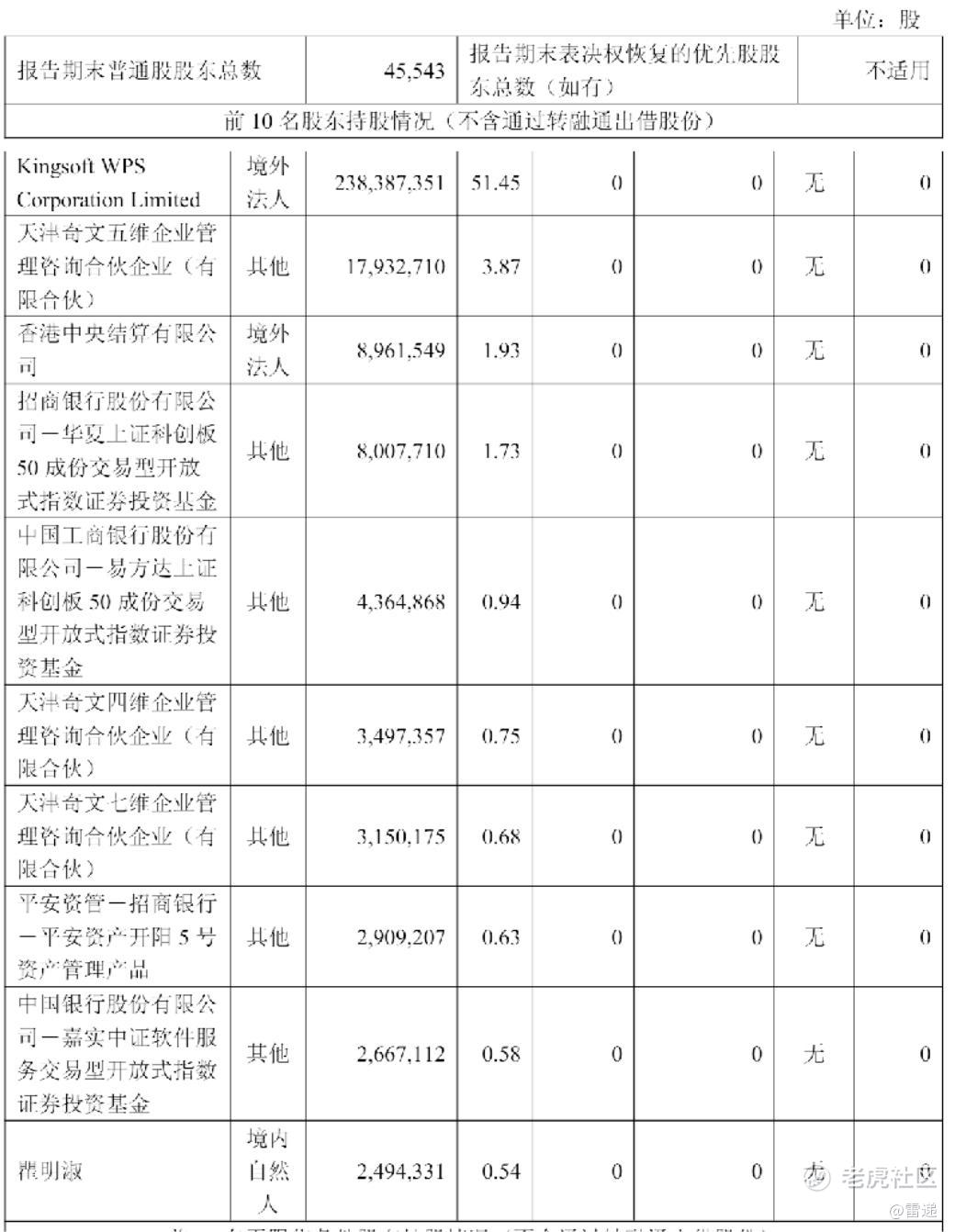 截至2026年3月31日,金山软件持有金山办公51.45%股权,天津奇文五维企业管理咨询合伙企业(有限合伙)持股为3.87%,香港中央结算有限公司持股为1.93%,招商银行股份有限公司-华夏上证科创板50成份交易型开放式指数证券投资基金持股1.73%,中国工商银行股份有限公司-易方达上证科创板 50 成份交易型开放式指数证券投资基金持股0.94%;