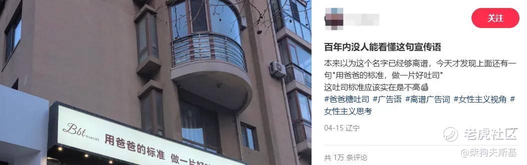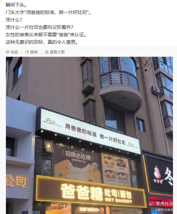 大概是有人在小某书上发笔记,是指责一家面包店名字和广告语不合适,这家面包店的名字叫“爸爸糖”,广告语是:用爸爸的标准,做一片好吐司……