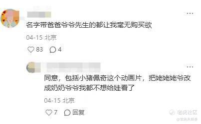 还有人说,“名字带爸爸爷爷先生的都让我毫无购买欲”有人则举双手赞成:同意,包括小猪佩奇这个动画片,把姥姥姥爷改成奶奶爷爷我都不想给娃看了。