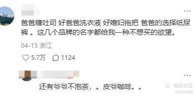 “爸爸糖吐司 好爸爸洗衣液 好媳妇拖把 爸爸的选择纸尿裤 。这几个品牌的名字都给我一种不想买的欲望”“还有爷爷不泡茶,皮爷咖啡”
