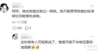 还有人表示:呵呵,其实我爸没做过一顿饭。我不敢想用我爸的标准做吐司能难吃成啥。她还顺带补了一句:这时候有人可能就说了,爸爸可能不会做但是标准高啊。
