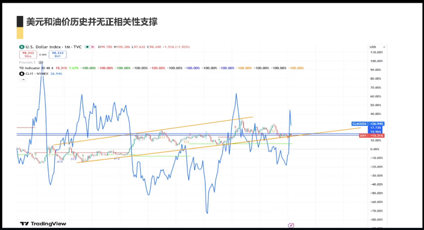 今年一季度美元与油价意外高度正相关,市场视局势紧张时同涨、缓和时同跌。但历史视角下,自08年金融危机,油价大起大落独立于美元,无明确正负相关。短期可能绑定,长线脱钩常见。程俊警告,现阶段逻辑不必然延续,油价涨不一定美元跟涨。