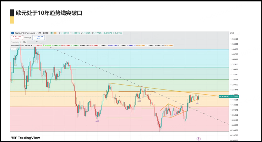 非美货币部分品种已突破,如商品货币澳元走强,欧元处于关键节点。美元整体弱势明显,对手盘承压,欧元突破将放大美元崩盘空间。技术面危险境地已现,十年周期下降通道测试需警惕。今年一季度欧元尝试未站稳,但机会存在。程俊提醒,美元尚未真正加速下行,后续取决于局势推进。