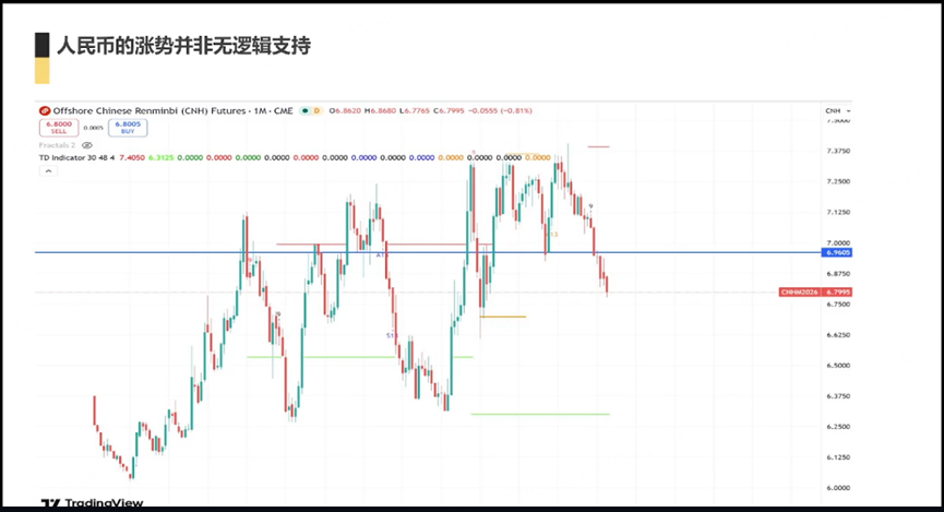 市场贯通逻辑加速美元压力。特朗普成为行情加速器,推动市场更快触顶,美元美债溢价支撑加速消磨。综合技术、基本、市场三面,美元长线看空逻辑清晰。人民币升值有坚实支撑:中国作为美国地位挑战者受益,经济韧性强,实体表现优于美国股指反馈,特朗普政策助攻外围环境。去年至今人民币涨势对得起基本面,稳固在7下方。