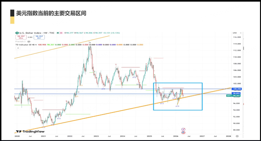 本期课堂以美伊新局势为背景,深入剖析当前市场行情,特别是美元资产的表现。上周股票、原油、黄金等资产变化不大,谈判仍在拉扯过程中,没有短期内完成最终结果的迹象。程俊指出,这一周重点关注外汇尤其是美元的风险,将美元资产描述为“四面楚歌”的状况,值得从中长线角度布局。美元资产主要涵盖美元指数、美债和美股,其中美股作为最后堡垒,美债收益率走势反向反映市场认可度。程俊持悲观看法,并阐述做多非美的逻辑框架:技术面弱势、基本面动摇、市场逻辑影响三方面合力推动美元下行。