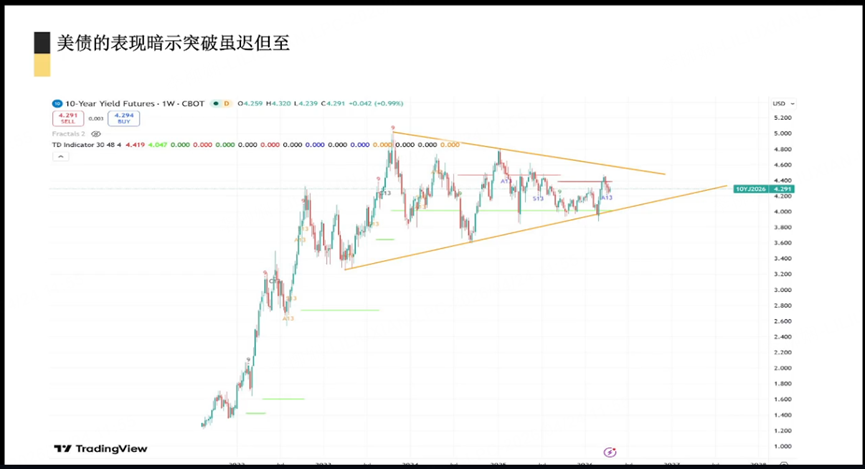 程俊首先概述美元资产的整体框架。美元指数代表传统外汇,美债通过收益率倒推市场受众程度,美股则是美元资产的核心支撑。上周已强调美股的重要性,但本周转向美元整体风险。谈判是谈是打或边打边谈,最终结果将指引市场,但当前拉扯导致行情稳定,美元弱势迹象已现。这为中长线布局提供机会,特别是做多非美货币,如人民币、欧元等。程俊强调,长线看空美元逻辑明显,源于多重压力叠加,而非单一因素。