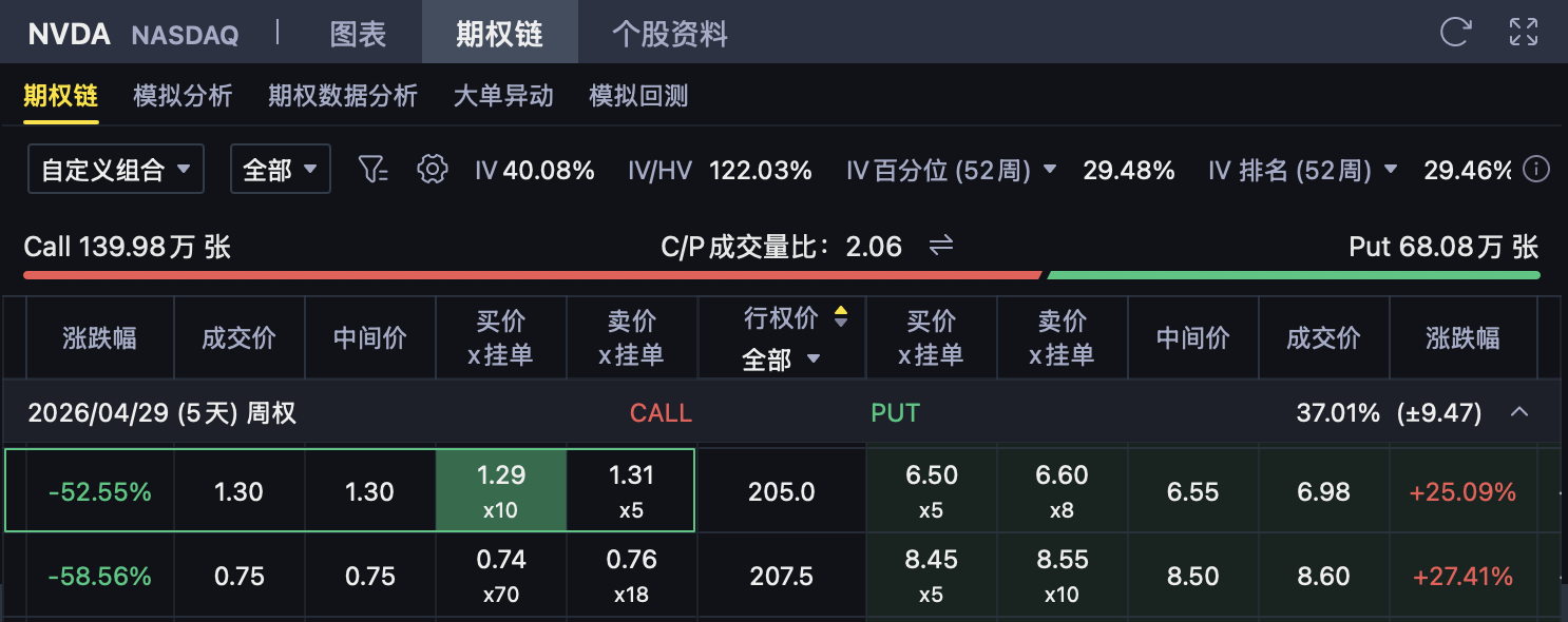这条Call腿用于博取NVDA在到期前难以有效站上205美元。只要到期价格≤205美元,这份Call失效,投资者可保留对应权利金。