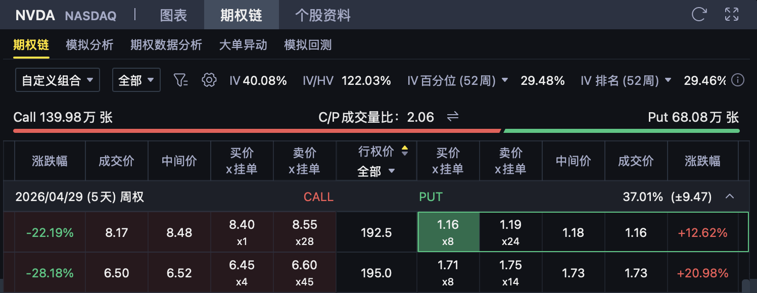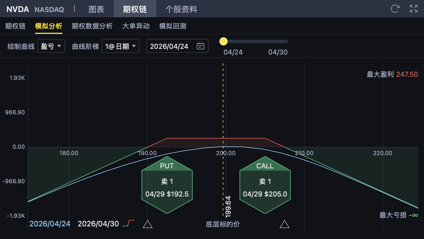 如果按短线盘面去理解,现在更像是“上方还有想象力、下方也有基本面支撑,但中间位置已经比较贵”的状态。你给出的这组4月29日到期结构,本质上是在做一组偏中性的宽跨式:卖出205 Call,同时卖出192.5 Put。它更适合表达“到期前NVDA大概率维持区间震荡,不容易有效跌破下沿,也未必顺畅突破上沿”的判断,而不是去赌单边大涨或大跌。这个思路也和当前市场状态比较贴:AI主线没坏,但高位追价的赔率已经下降。