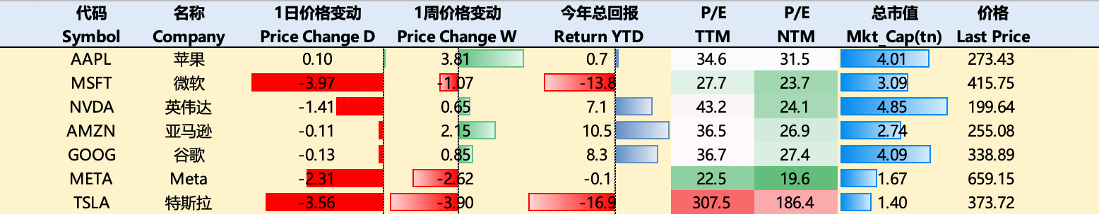 中东局势继续反复,同时下周多家科技巨头将公布一季度财报,市场进入财报交易阶段。截至4月23日收盘,过去一周 $苹果(AAPL)$ 3.81%, $微软(MSFT)$ -1.07%, $英伟达(NVDA)$ 0.65%, $亚马逊(AMZN)$ 2.15%, $谷歌(GOOG)$ 0.85%, $Meta Platforms, Inc.(META)$ -2.62%, $特斯拉(TSLA)$ -3.9%.