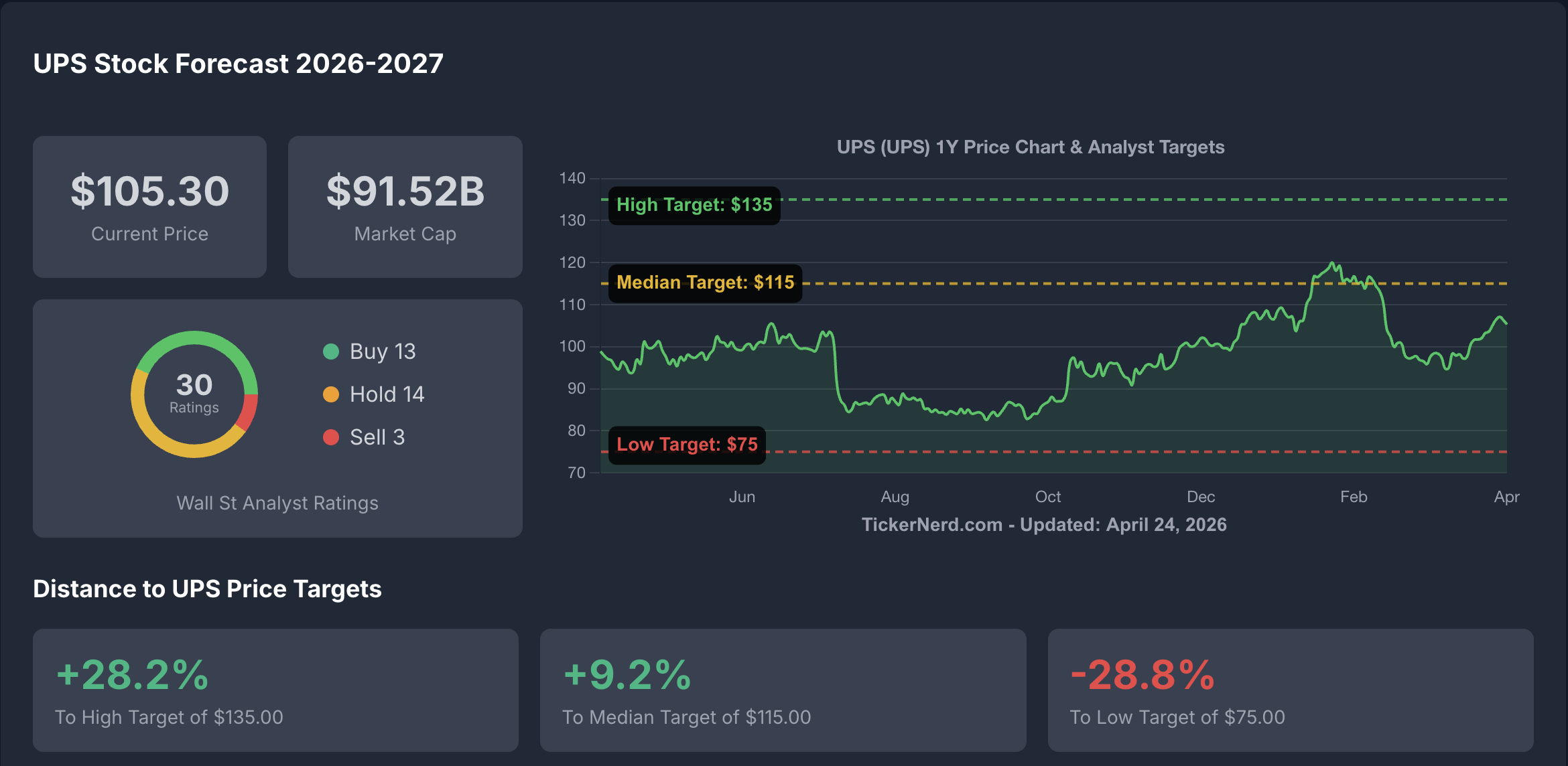 小虎们,随著美股财报季进入中段,全球物流龙头 $联合包裹(UPS)$ 即将公布2026年第一季度业绩。市场普遍预期,公司本季度每股盈利约为1.05至1.10美元区间,较去年同期略有波动,但整体仍处于调整阶段。