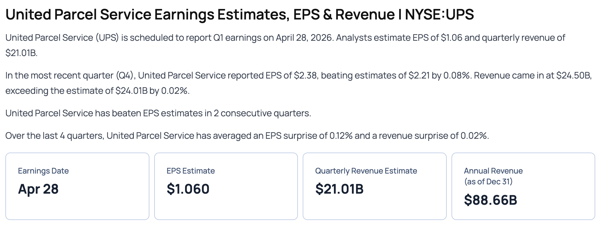 对于即将公布的 2026 年第一季度业绩,市场预期大致集中在 EPS 1.06至1.11美元、收入约210亿美元。Benzinga 数据显示,分析师预期 UPS 第一季度 EPS 约 1.06美元、收入约 210.1亿美元;MarketBeat 统计的预期略高,为 EPS 1.11美元、收入 210.532亿美元;Yahoo Finance 旗下文章引用的市场预期则显示,收入约 210.8亿美元,按年下降约 2.2%。