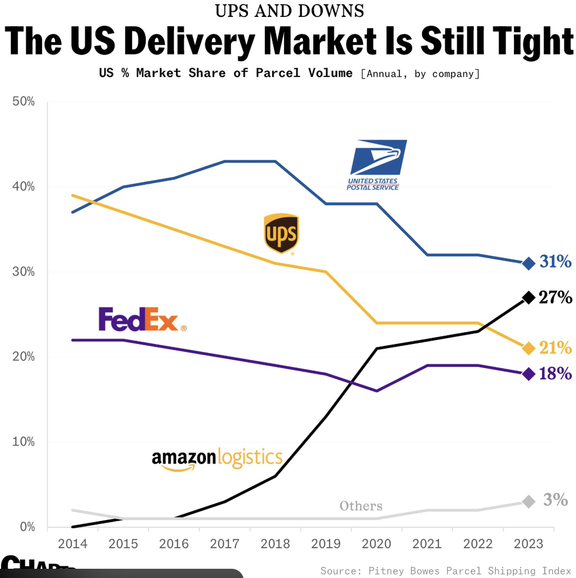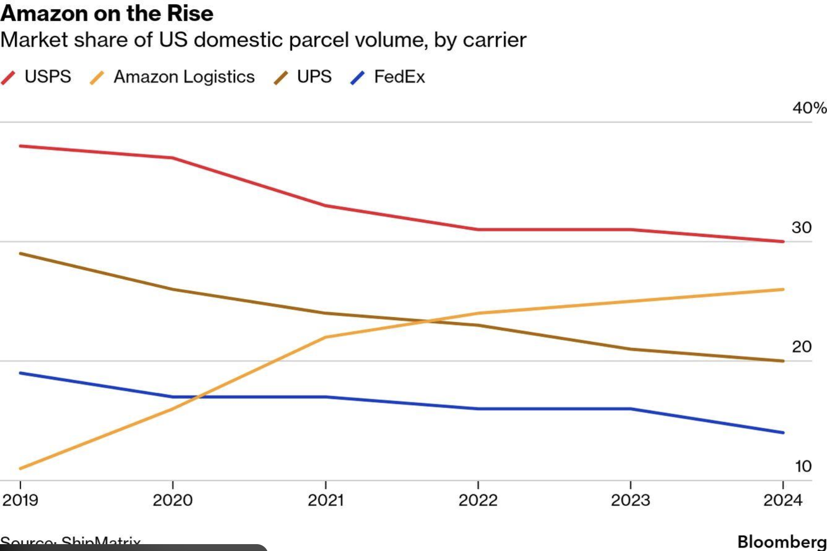 Amazon的优势在于规模与生态,其物流网络不仅服务自身电商,亦逐步对外开放,并在「最后一公里配送」上建立了极强竞争力。同时,其成本结构在规模效应下持续优化,对传统物流企业形成长期压制。但其劣势在于物流业务本身并非主要盈利来源,资本开支极高,且整体估值更依赖云计算与AI业务,而非物流。