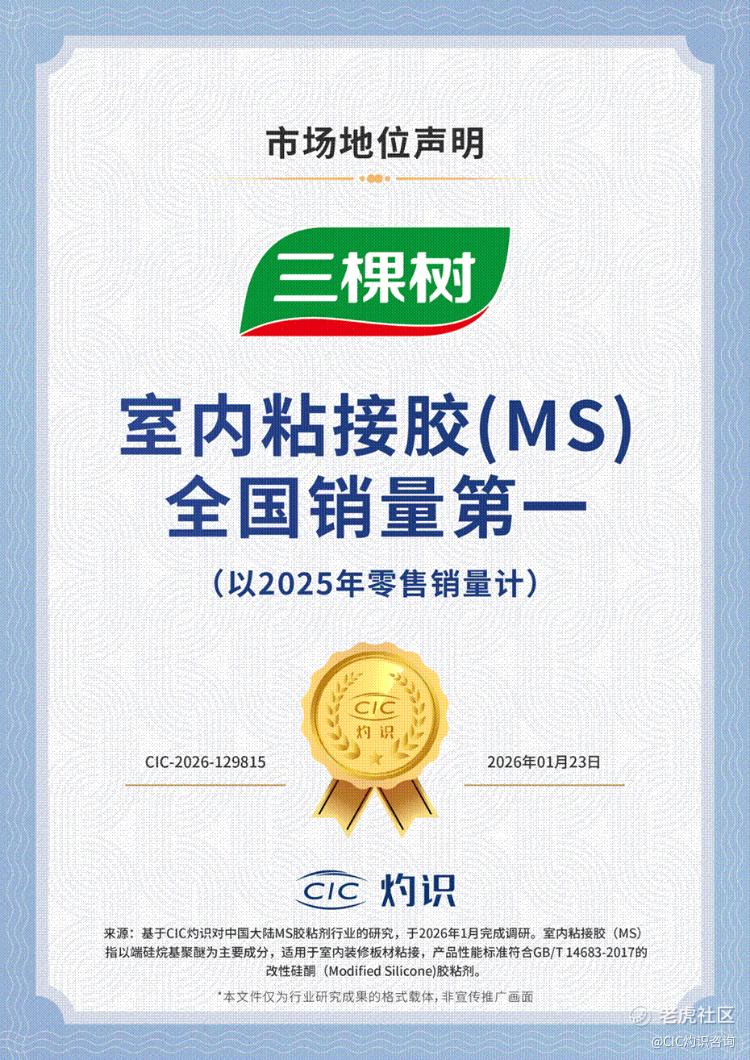 近日,三棵树取得由国际权威咨询机构CIC灼识确认的“室内粘接胶(MS)全国销量第一(以2025年零售销量计)”市场地位声明!