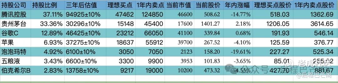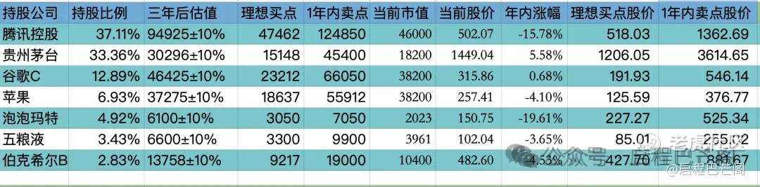 目前十大持仓:腾讯37.11%,贵州茅台33.36%,谷歌12.89%,苹果6.93%,泡泡玛特4.92%,五粮液3.43%,伯克希尔2.83%。目前九大持仓占比88%(其中科技股占比56.93%,白酒股占比36.79%;A股占比36.79%,港股占比42.03%,美股占比22.65%),还有12%观察仓和现金。