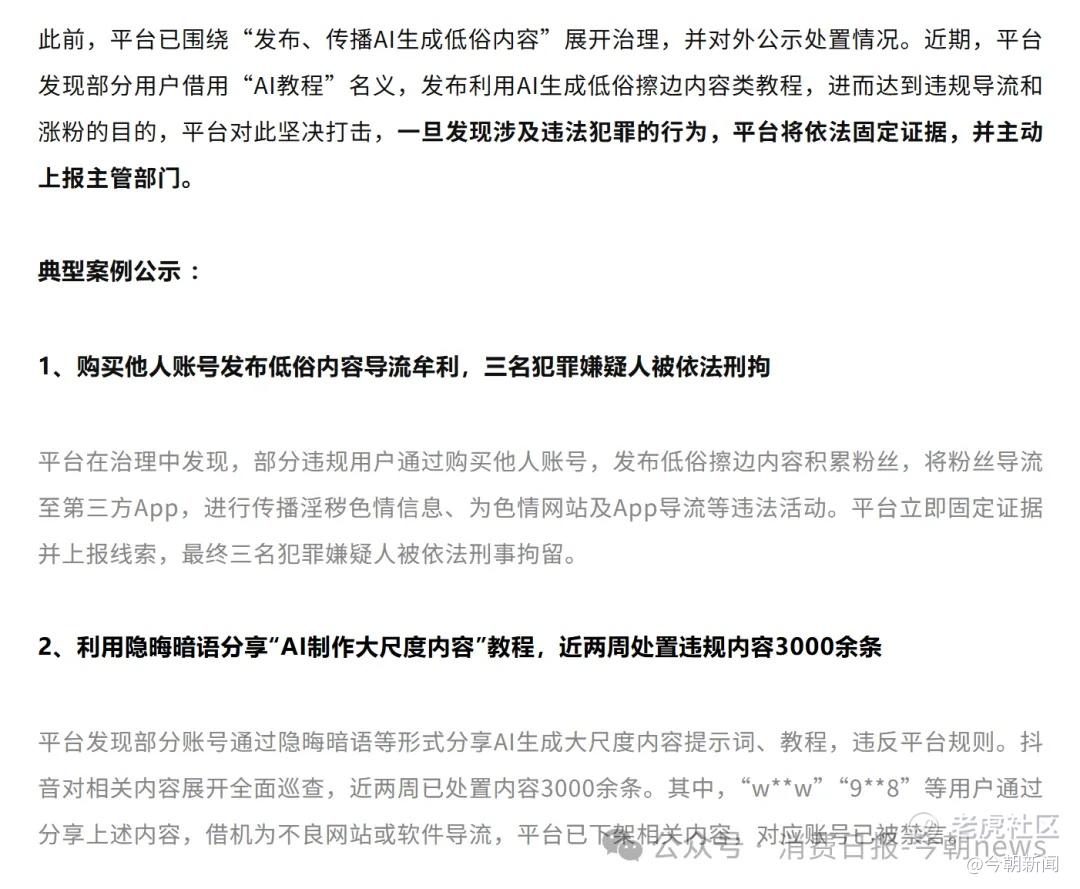 抖音公示了两起典型案例。其一,部分违规用户通过购买他人账号,发布低俗擦边内容积累粉丝,将粉丝导流至第三方App,进行传播淫秽色情信息、为色情网站及App导流等违法活动。平台立即固定证据并上报线索,最终三名犯罪嫌疑人被依法刑事拘留。其二,平台发现部分账号通过隐晦暗语等形式分享AI生成大尺度内容提示词、教程,违反平台规则。抖音对相关内容展开全面巡查,近两周已处置内容3000余条。其中,“w**w”“9**8”等用户通过分享上述内容,借机为不良网站或软件导流,平台已下架相关内容,对应账号已被禁言。