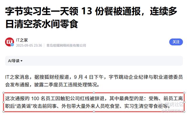 IT之家:字节实习生一天领 13 份餐被通报,连续多日清空茶水间零食