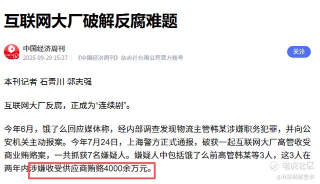 第一财经:互联网大厂反腐难:“小官巨贪”频现,有员工一人受贿高达208万