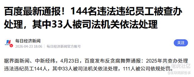 在数据层面,2025年百度共查办处理了144名违法违纪员工。期间除33人被司法机关依法处理外,还有111人被公司依规处罚。