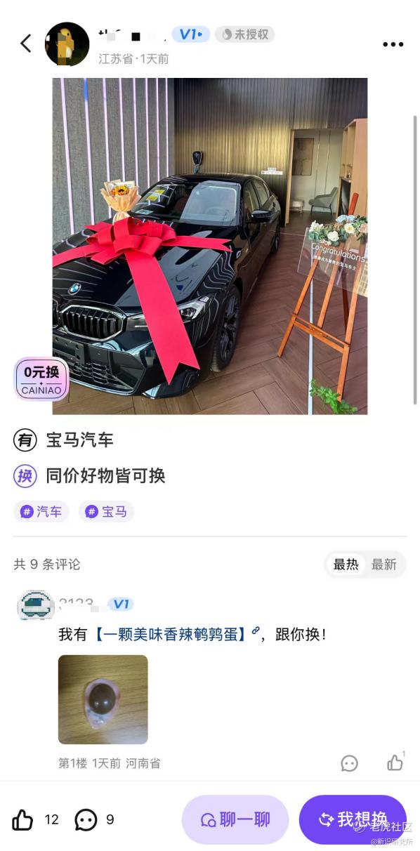 有人挂出一辆宝马,标着“0元换”,评论区第一楼写着:“我有一颗美味香辣鹌鹑蛋,跟你换!”。一颗鹌鹑蛋换一台宝马,香不香辣的不知道,但这要是放在现实世界,警察叔叔可能都要上门了。