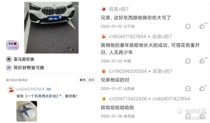 仔细看这些帖子,你会发现一套完整的“抽象语法”,交换标的物的价值差距越大,评论区越热闹,拒绝理由越无厘头,后续的互动越频繁。