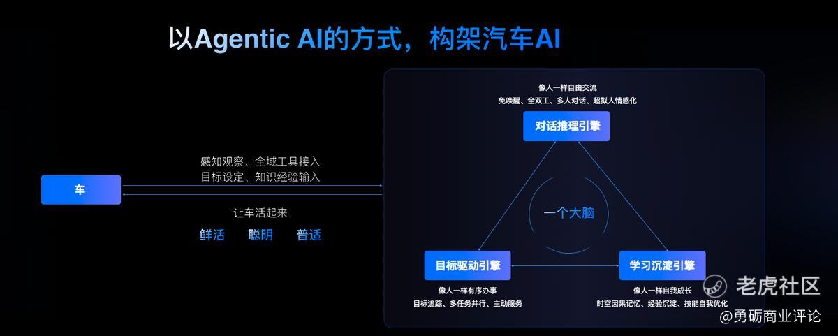 基于行业首个全链路端到端AI座舱架构,本次发布的全新解决方案彻底颠覆了上一代智能座舱 “意图分域 + 多 Agent协同”的语音助手架构,通过一个AI大脑深度联动整车,打通车控、导航、智驾等关键功能域,实现 "感知 - 推理 - 执行 - 记忆 - 学习" 一体化闭环。