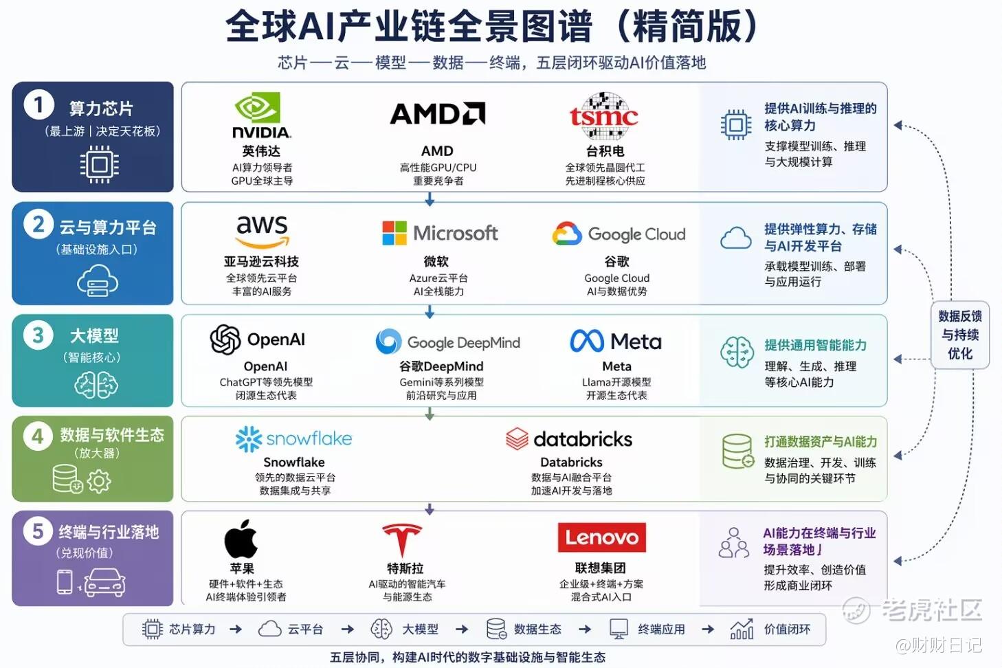 $联想集团(00992)$ 晚上刷到一张全球AI产业链全景图,从芯片到云到模型到数据再到终端,五层。前四层基本是美股天下——英伟达、AMD、台积电、AWS、微软、谷歌、OpenAI、Snowflake,挨个数都是熟面孔。
