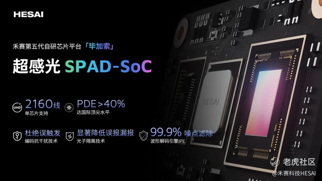 「毕加索 SPAD-SoC 」是禾赛「毕加索」平台的首款芯片,也是全球首款 6D 全彩激光雷达超感光芯片,其光子探测效率(PDE)已突破 40%,达国际顶尖水平。