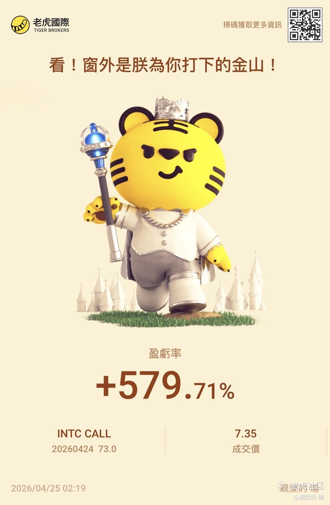 $INTC 20260424 73.0 CALL$ 周末又可以去消费了[得意] [得意] 可以买口红喝奶茶啦,感谢赞助[得意] [得意]
