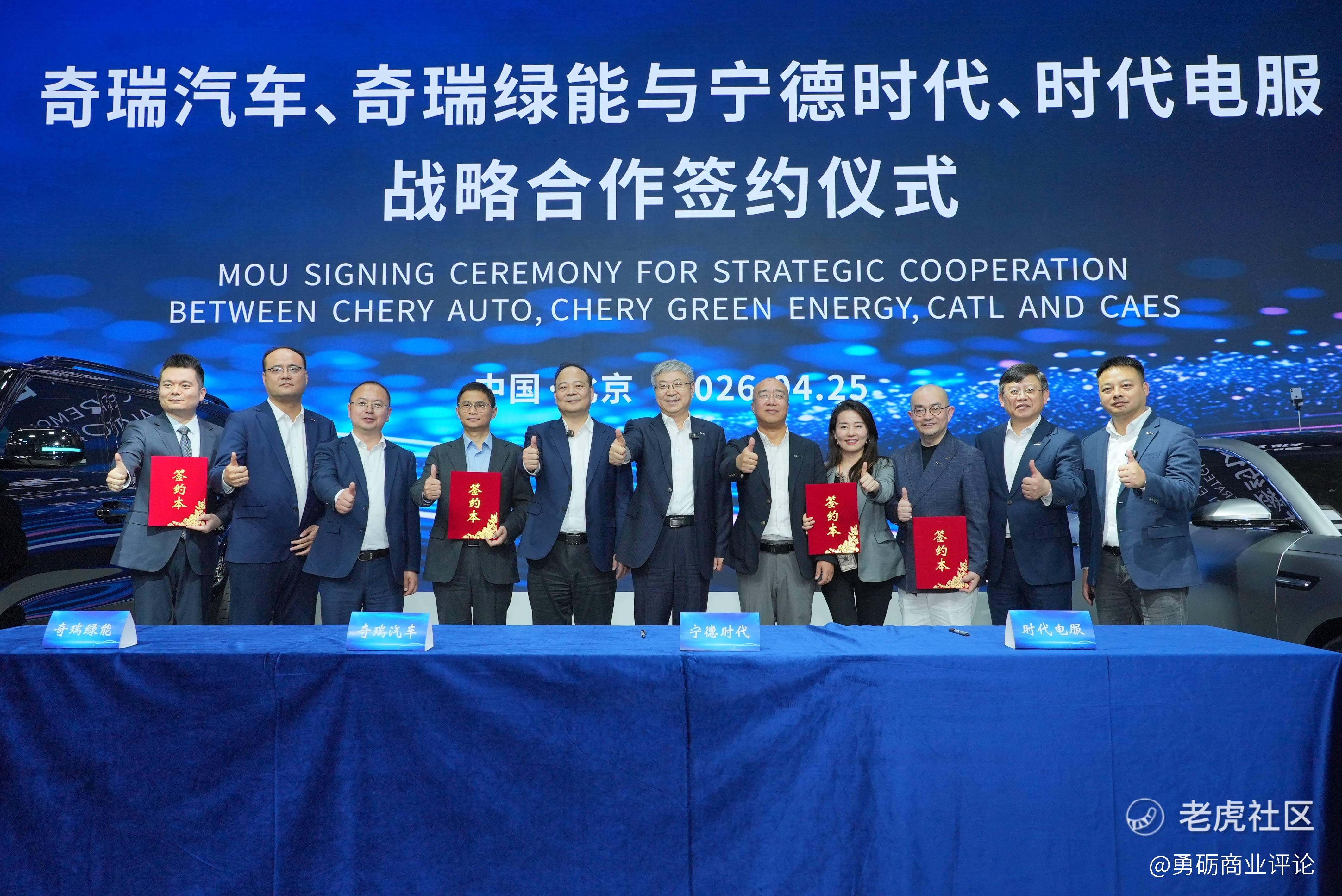 4月25日,奇瑞汽车股份有限公司(以下简称“奇瑞汽车”)、宁德时代新能源科技股份有限公司(以下简称“宁德时代”)、时代电服科技有限公司(以下简称“时代电服”)、奇瑞绿能生态科技有限公司(以下简称“奇瑞绿能”)在北京签署战略合作协议。各方将全面深化能源战略合作,聚焦超换共享网络布局、绿色能源生态共建等领域,共同推动新能源产业高质量发展。