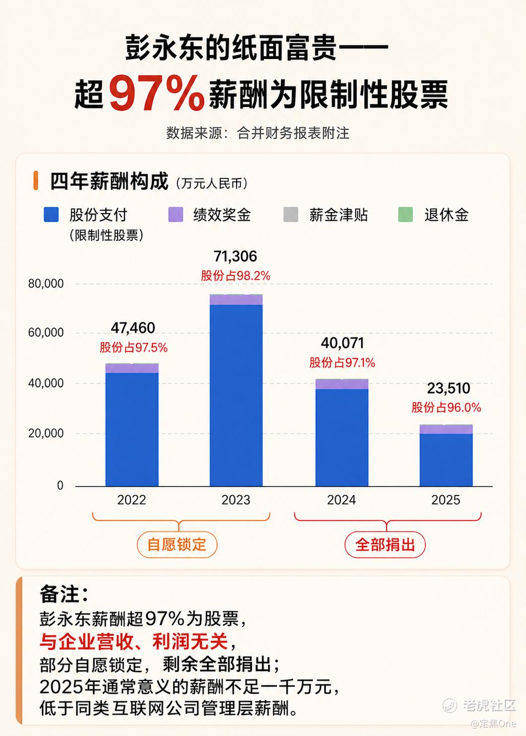 从过去四年的薪酬构成看,彭永东实际的现金薪酬占全部薪酬总额的不到3%,剩下97%全是股份支付薪酬。
