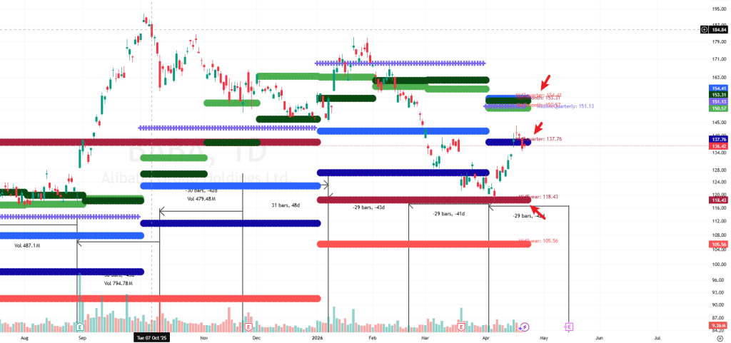 若 BABA 股价能再向上,下一个阻力区间云集在 154元,那是见高就沽的位置。BABA 的下一个周期低点时间窗口在 5月14日。届时有好的价位(如再度回调到年度信号线支持),值得留意低吸机会。愿各位投资者在变幻莫测的 2026 年中,既能见证周期的力量,亦能捕捉关键的机会。