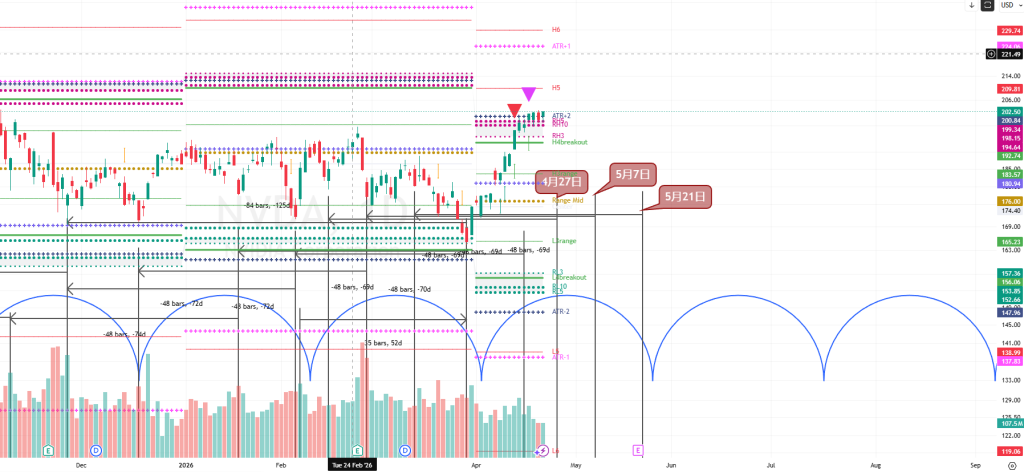 从周期上看(参见上图),可以见到非常稳定的 48交易日(约72自然日)中期周期交错出现。由此推算,4月27日、5月7日、5月21日 是值得主要的时间窗。而短期的周期低点 36 交易日则出现在 5月21日 附近。由于结构向好,当这些时间窗到来时,未来值得注意回调到支持位的买入机会。