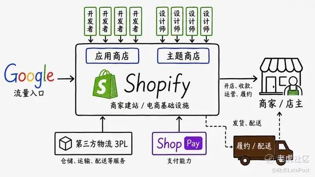 Shopify 能力和合作关系示意图。来源:Ben Thompson、晚点、ChatGPT