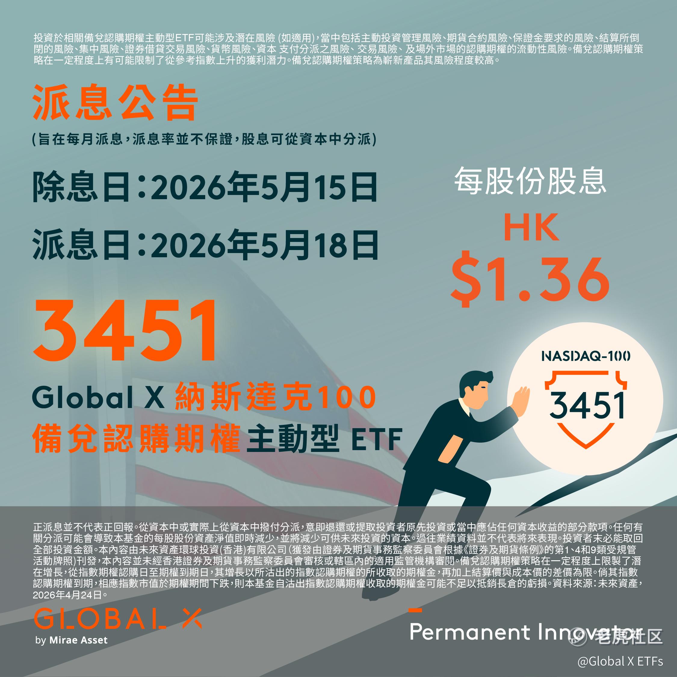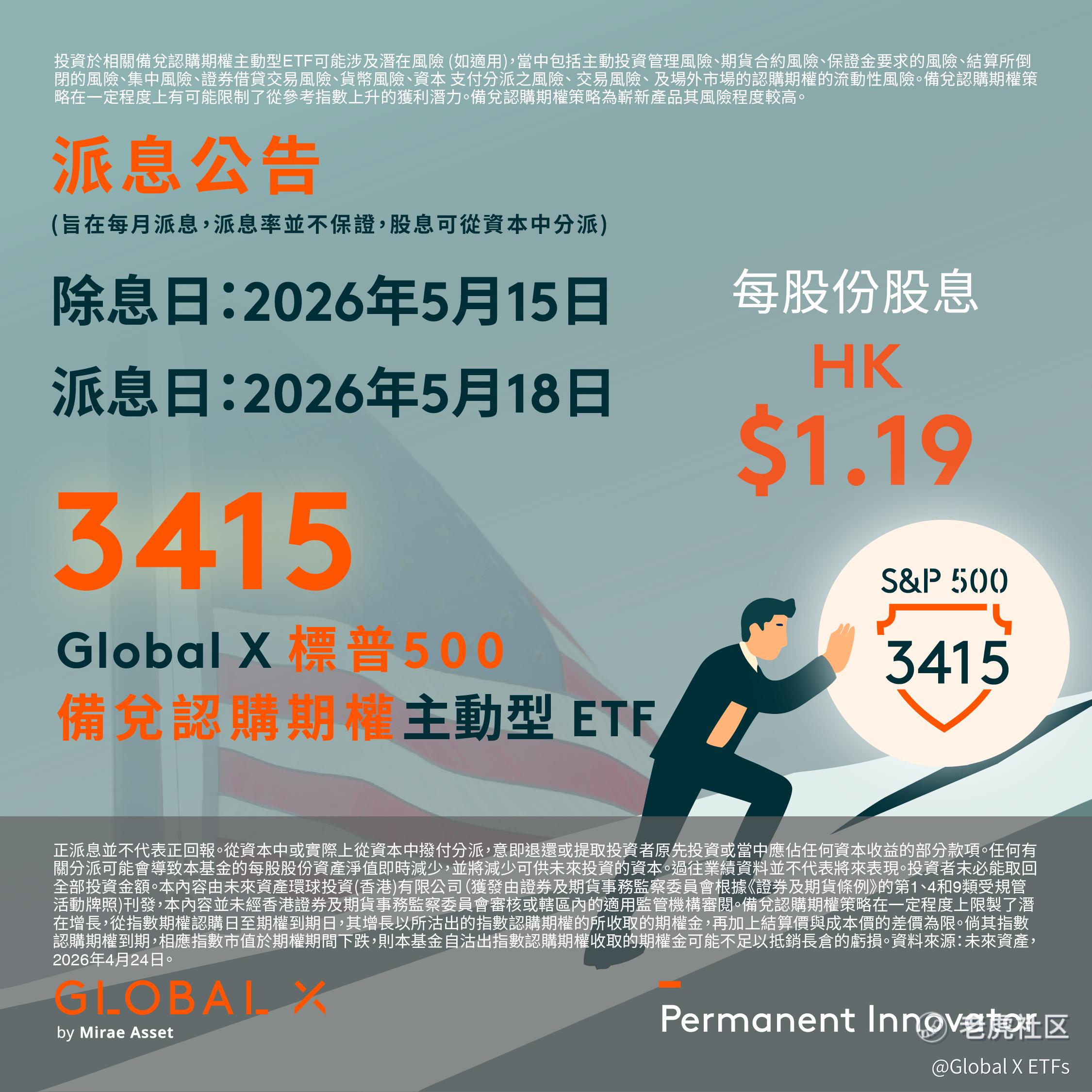 Global X标普500备兑认购期权主动型ETF(3415/ 9415)及Global X 纳斯达克100备兑认购期权主动型ETF (3451/ 9451) 即将派息!