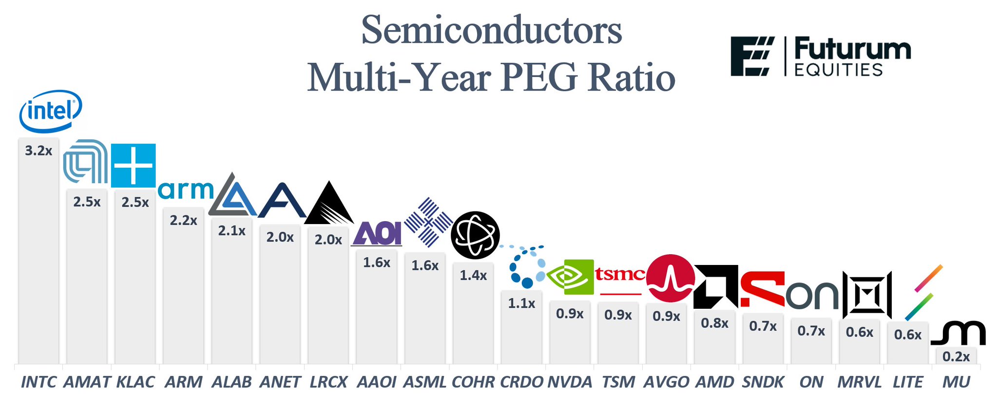 但现实情况是,目前这个板块里涨得最猛的,很多反而在“高PEG”区间(设备、材料),一方面可能是资金在押“盈利加速”,一方面可能类似光模块链,想象空间更大,比如 $ARM Holdings(ARM)$ 虽然估值贵,但股价已经突破了,反而是真正“便宜”的,类似台积电、AMD,反而涨幅偏向于更理性。