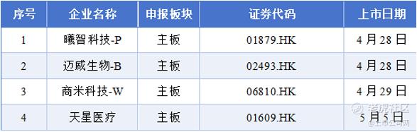 4月19日至4月25日期间,曦智科技-P、迈威生物-B、商米科技-W已完成招股即将上市;天星医疗则正在招股中。