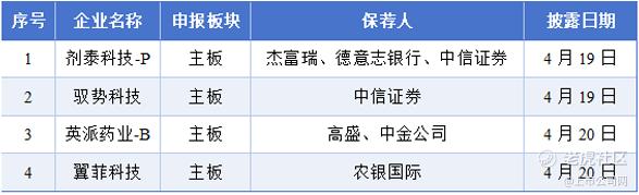 1)、4月19日,剂泰科技-P通过港交所聆讯,拟在香港主板上市,联席保荐人为杰富瑞、德意志银行、中信证券。