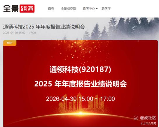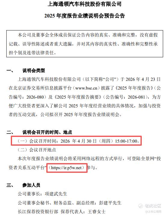4月23日,上海通领汽车科技股份有限公司(证券代码:920187,证券简称:通领科技)正式发布《2025年度报告业绩说明会预告公告》,本次业绩说明会定于2026年4月30日(周四)15:00-17:00举行,将采用网络远程方式开展,欢迎广大投资者登陆全景网“投资者关系互动平台”(https://ir.p5w.net)踊跃参与提问、互动,与公司高管零距离交流,深入了解公司经营细节与发展规划,挖掘公司发展价值。