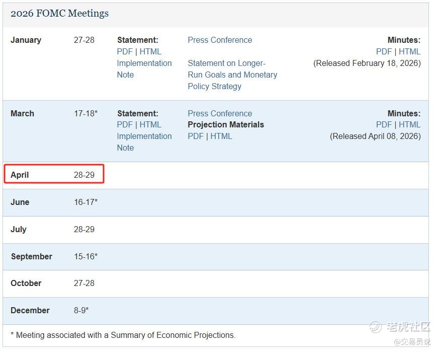 本周四凌晨两点,美联储FOMC将公布四月末的利率决议结果,主流预期认为美联储将维持3.5%到3.75%的联邦基金利率区间不变。