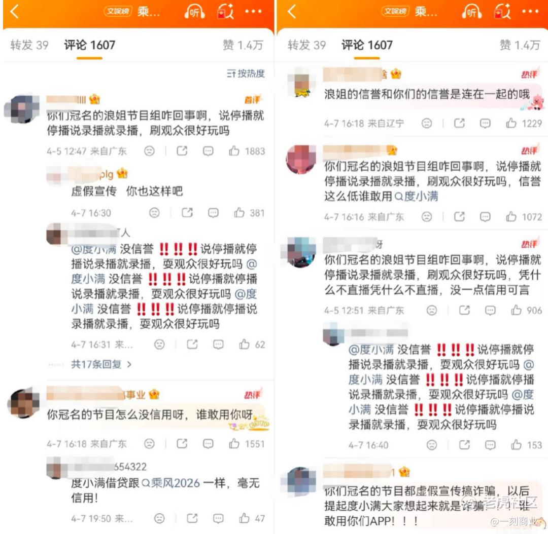 甚至《浪姐7》因节目设置问题,引发负面舆论时,度小满也跟着被“冲”。4月初,《浪姐7》因多次临时取消直播引发观众不满,怒火直接烧向了冠名商。度小满的官方账号评论区迅速沦陷,网友迁怒道,“节目组和冠名商一样,毫无信用可言。”