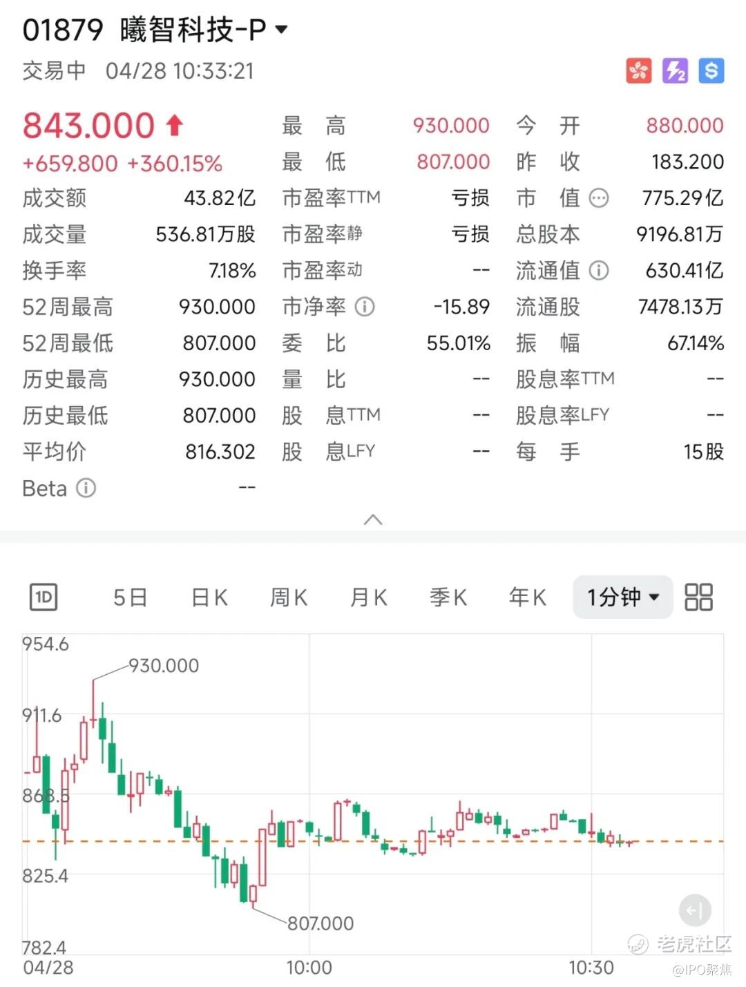 今日开盘最高涨幅达到407.64%,报930.00港元。截至发文前,涨360.15%,报843.00港元,总市值775.29亿港元。