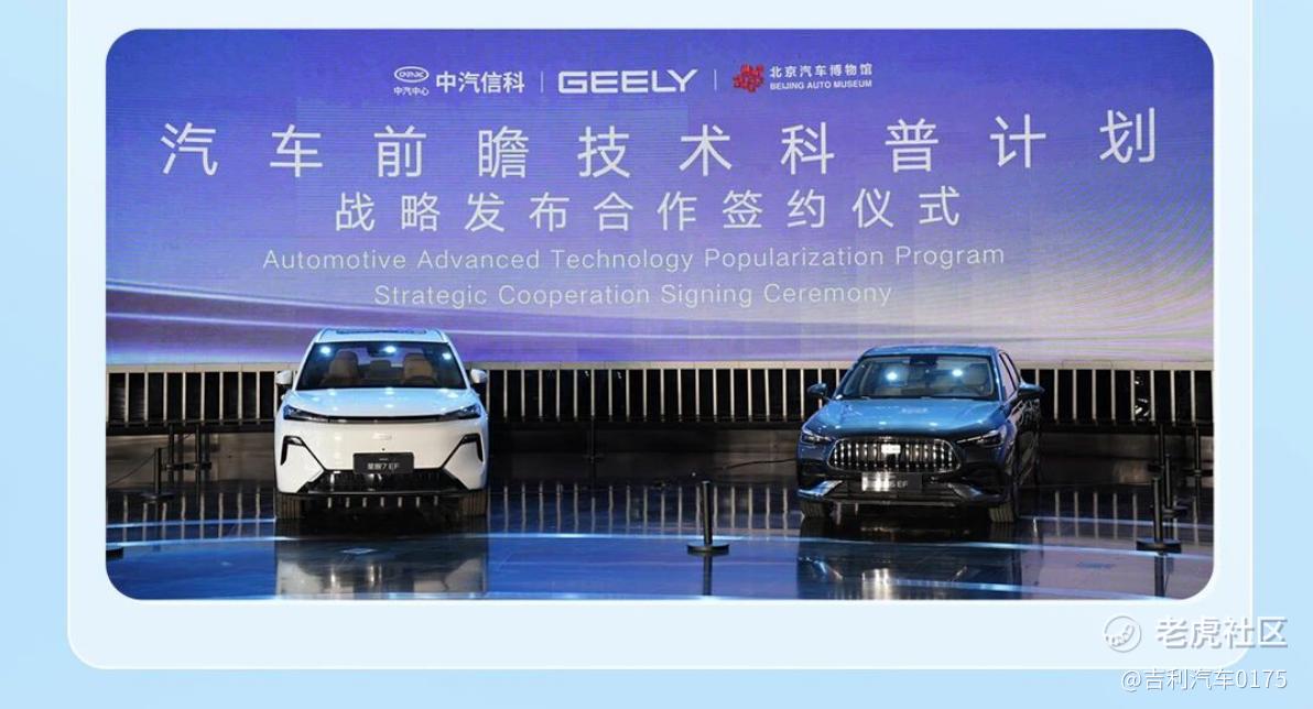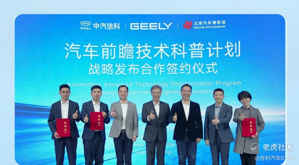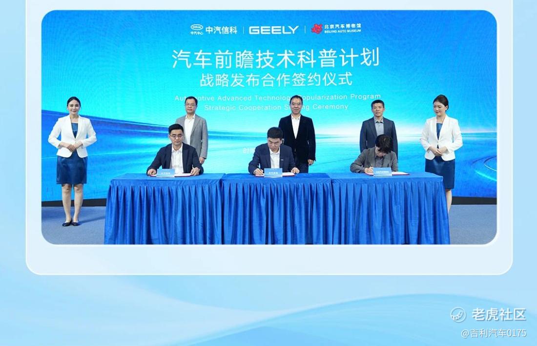 近日,浙江吉利控股集团与中汽信科、北京汽车博物馆共同签署合作协议,正式启动“汽车前瞻技术科普计划”,三方将围绕汽车前瞻技术科普展开深度合作,构建“技术验证一成果展示一公众教育”的科普新范式。浙江吉利控股集团高级副总裁杨学良、北京汽车博物馆馆长刘井权、中国汽车技术研究中心有限公司党委委员、副总经理李洧等领导出席并见证签约仪式。