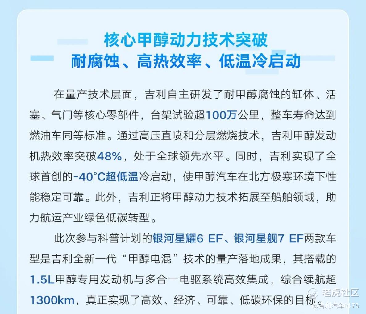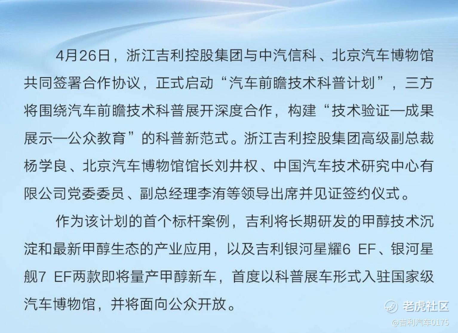 作为该计划的首个标杆案例,吉利将长期研发的甲醇技术沉淀和最新甲醇生态的产业应用,以及吉利银河星耀6 EF、银河星舰7 EF两款即将量产甲醇新车,首度以科普展车形式入驻国家级汽车博物馆,并将面向公众开放。