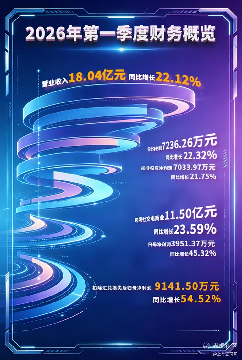 报告期内,公司实现营业收入180,431.41万元,同比增长22.12%,归属于上市公司股东的净利润7,236.26万元,同比增长22.32%,扣除非经常性损益后归属于上市公司股东的净利润7,033.97万元,同比增长21.75%。其中,公司跨境社交电商业务实现营业收入114,951.20万元,同比增长23.59%,归母净利润3,951.37万元,同比增长45.32%。