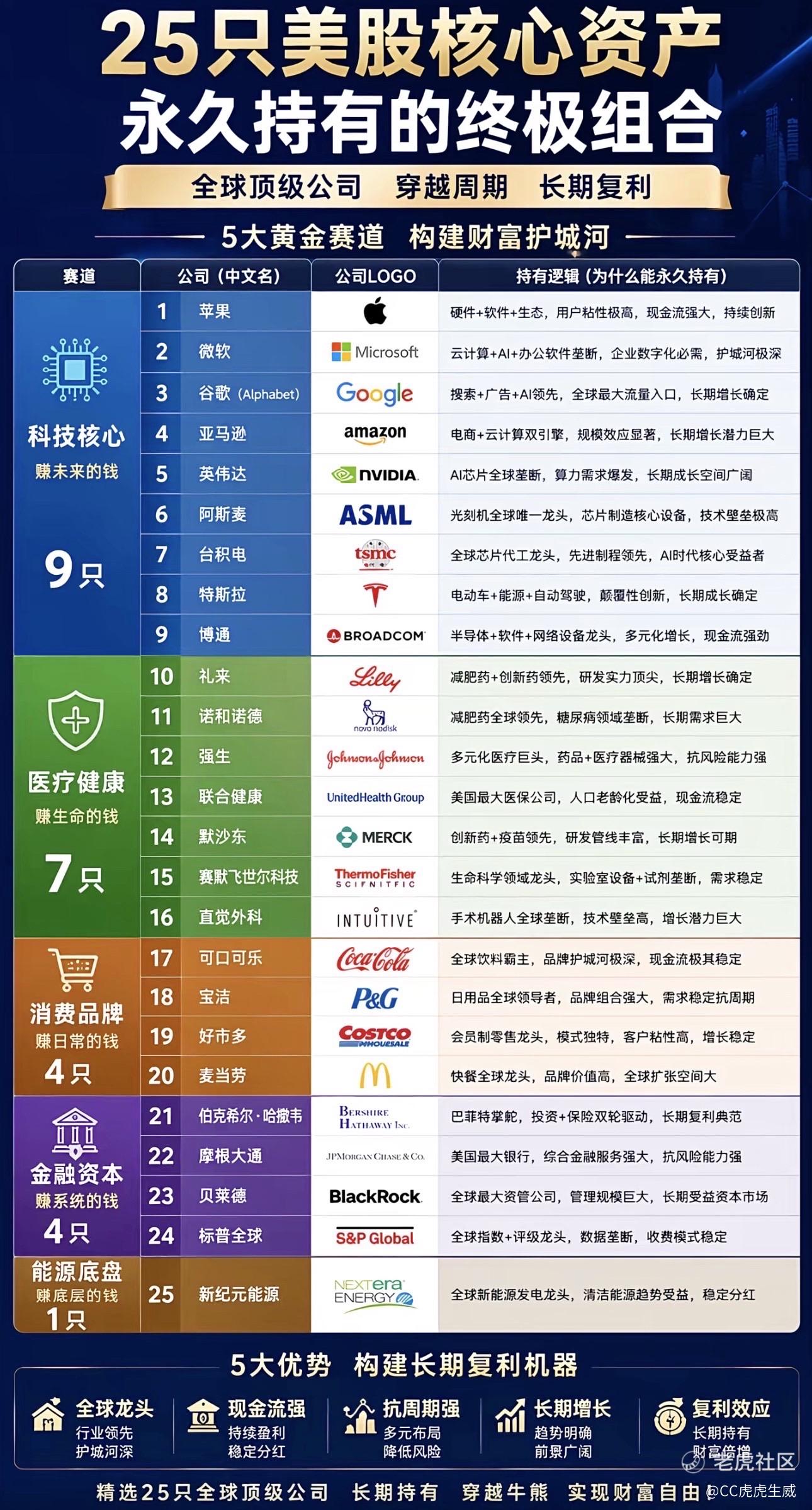 “这张‘25只美股核心资产’图表挺有参考价值的,它把全球顶级公司按‘赚未来的钱’‘赚生命的钱’等5大赛道分类,每只股票的‘持有逻辑’都写得很直白,像苹果的生态粘性、微软的云计算垄断、礼来的减肥药领先——这些都是能穿越周期的护城河。