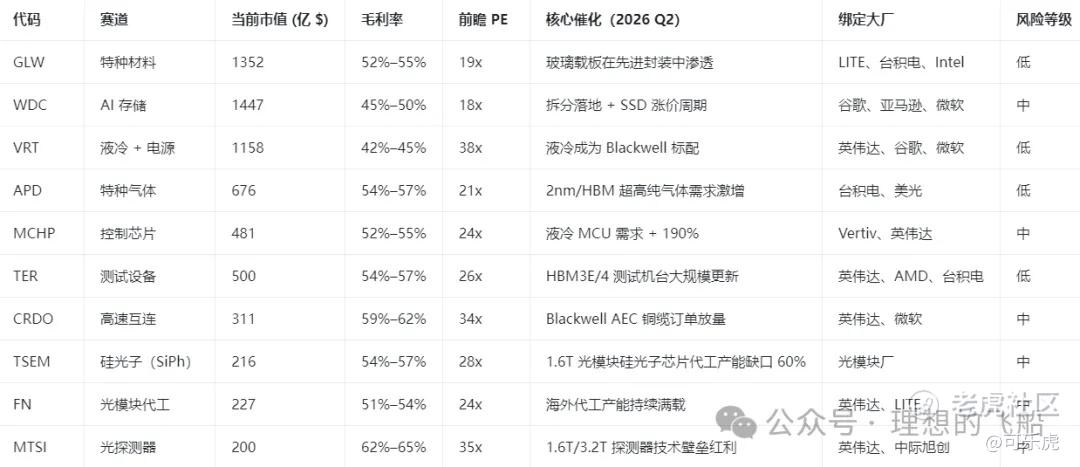 $TSEM 硅光子(SiPh)领头羊 市值216亿 毛利率:54%–57% 28x 核心催化: 1.6T 光模块中的硅光子芯片代工产能缺口超过 60%。 除了光模块厂本身以外,稳健的底层“卖水人”