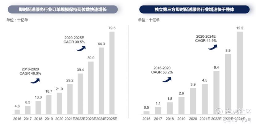 即时配送行业过去主要是外卖驱动为主,2016-2020年订单规模CAGR为46.0%。尽管外卖已经过了高速增长期,但是消费者对即时物流、即时消费越来越习惯,即时配送服务拓展的场景越来越丰富,预计2020-2025年行业订单规模仍能保持CAGR 30.5%的高速增长。而基于新的发展趋势,对独立第三方配送方的需求也更强烈了。